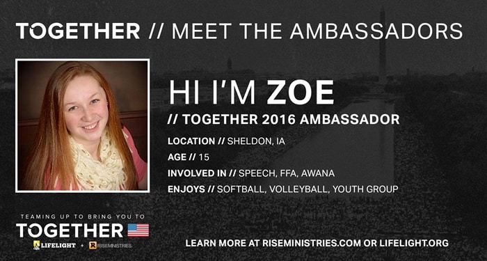 “The reason I am so excited about Together 2016 is because I can't wait to experience something as great as this! Together is going to be a life changing experience for me, I can already feel it! I can't wait to take what I learn from Together and spread the word with everyone back home! I don't think there is anything more majestic than standing on the National Mall with 1 million other people saying that I am for God! TOGETHER 2016 is a once in a lifetime experience that you can pass down from generation to generation! This life changing experience should be seen and felt by all, hope to see you at TOGETHER 2016!”