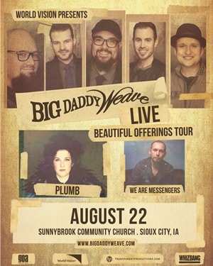 LOCATION CHANGE for the Beautiful Offerings Tour featuring Big Daddy Weave, Plumb, and We Are Messengers! The show will now take place at Sunnybrook Community Church? on August 22nd! Get your tickets today! Promo video and event details can be found here.