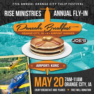 Tulip Festival is coming this week and so is the RISE Ministries Fly-In Pancake Breakfast! On Saturday, May 20 stop by the Orange City Airport from 7-11 AM for a good hearty breakfast of pancakes, sausage, bacon, juice, milk and coffee! Don’t forget to check out the planes coming and going while you’re there. Free-will donations will be accepted to help fund RiseFest, June 16 and 17 in Sheldon.